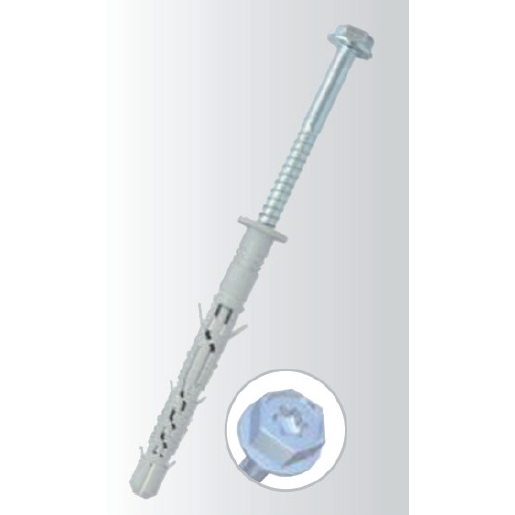 Nylonová hmoždinka s ocelovým vrutem se šestihrannou hlavou.